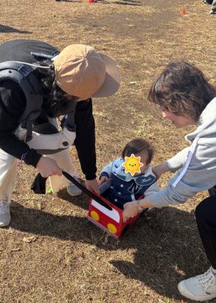 ママやパパがひいてくれる箱車に乗って果物をゲットしてゴールです!🚙